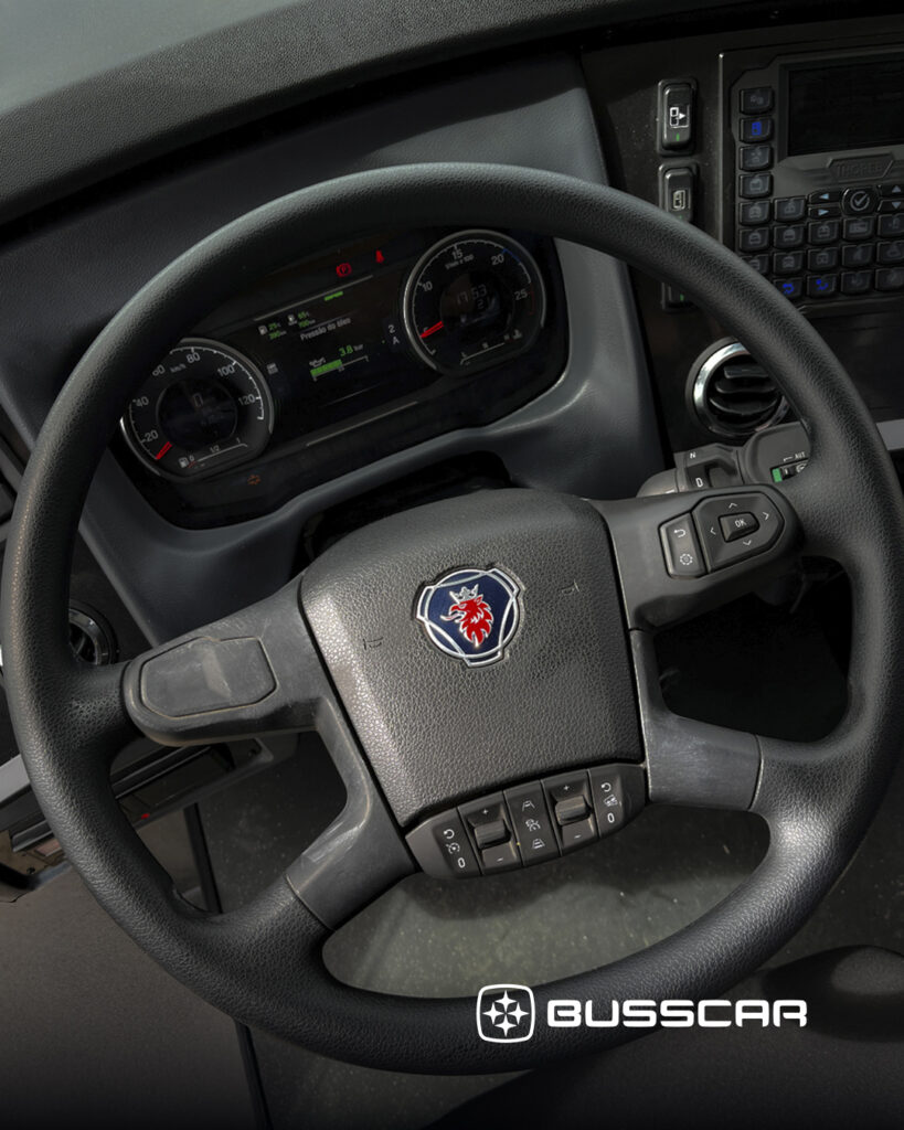 O posto de condução recebeu atenção especial: a poltrona do motorista Isringhausen modelo NTS1, vibratória para sistema de assistência, é equipada com amortecedor pneumático, cinto de segurança integrado de três pontos, apoios de braço escamoteáveis nos dois lados e revestimento com capa seriada, proporcionando ergonomia, conforto e segurança em longas jornadas.
