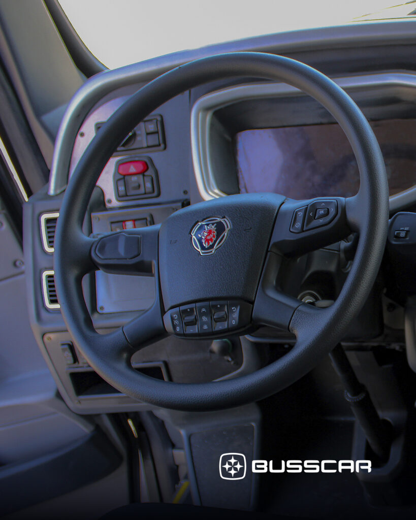 As unidades com chassi Scania K320C B4x2 foram configuradas com 46 poltronas Class Superpullman BUSSCAR, desenvolvidas para oferecer máximo conforto em viagens de média e longa duração. Com espuma viscoelástica, encosto e assento anatômicos, as poltronas proporcionam melhor apoio ao corpo e reduzem a fadiga ao longo do trajeto, além de contar com braços escamoteáveis e apoio para os pés tipo balancim. Os revestimentos foram definidos conforme a operação do cliente, reforçando a personalização do projeto. Já as duas unidades montadas sobre o chassi Scania K450C B6x2 acomodam 48 passageiros em poltronas Leito Turismo + Configuração de Rodomoça para atendimento a bordo, que facilita o controle do salão, sem ocupar um assento regular de passageiro, todas as poltronas são equipadas com espuma Hipersoft de 50 mm, viscoelástico e apoio de cabeça extra, além de apoio para pés e pernas com plataforma no salão, elevando ainda mais o padrão de conforto e bem-estar nas operações rodoviárias.