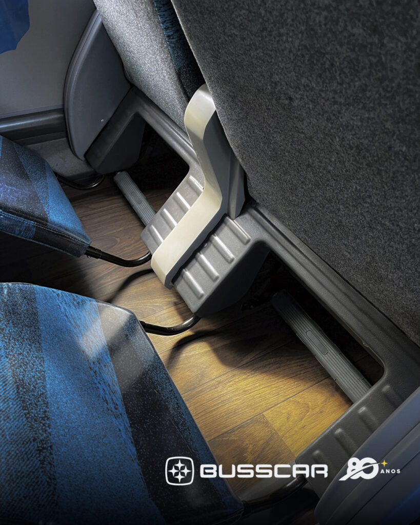 No salão inferior, estão as 12 poltronas Leito, projetadas para proporcionar maior conforto em viagens de longa duração. Com maior amplitude de reclinação e estrutura em espuma viscoelástica, oferecem melhor acomodação do corpo e redução da fadiga, sendo especialmente indicadas para operações noturnas. O conjunto inclui apoio de braço lateral fixo, apoio de pés com balancim, apoio para pernas, porta-copos individuais e cinto de segurança abdominal retrátil.