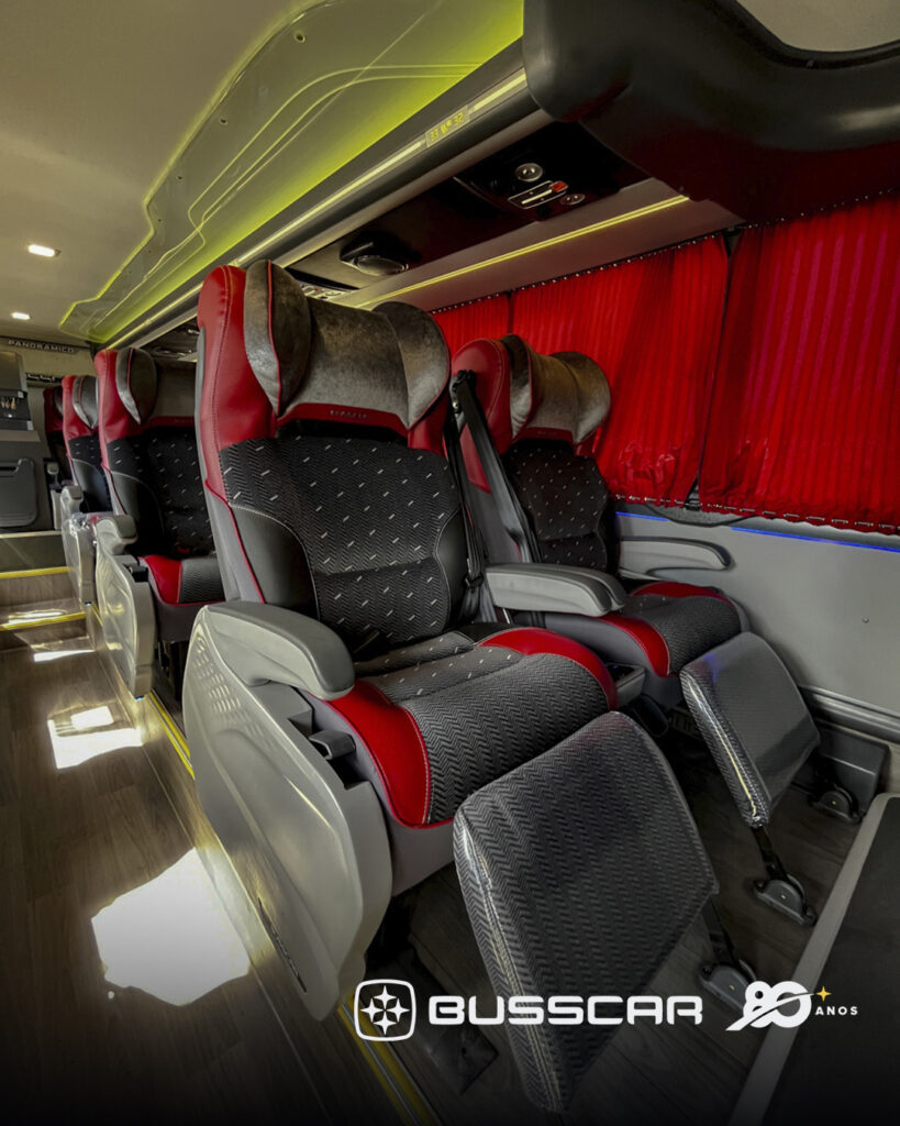 O veículo foi configurado especialmente para atender às especificações operacionais do cliente e conta com 43 poltronas Leito, desenvolvidas para proporcionar elevado padrão de conforto em viagens de média e longa distância. As poltronas possuem estrutura anatômica que favorece o apoio das regiões lombar e cervical, além de apoio de cabeça extra, contribuindo para uma postura mais natural e relaxante ao longo do percurso.