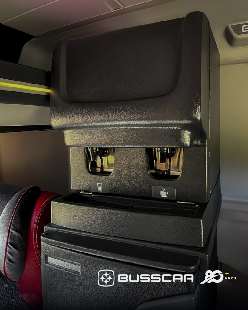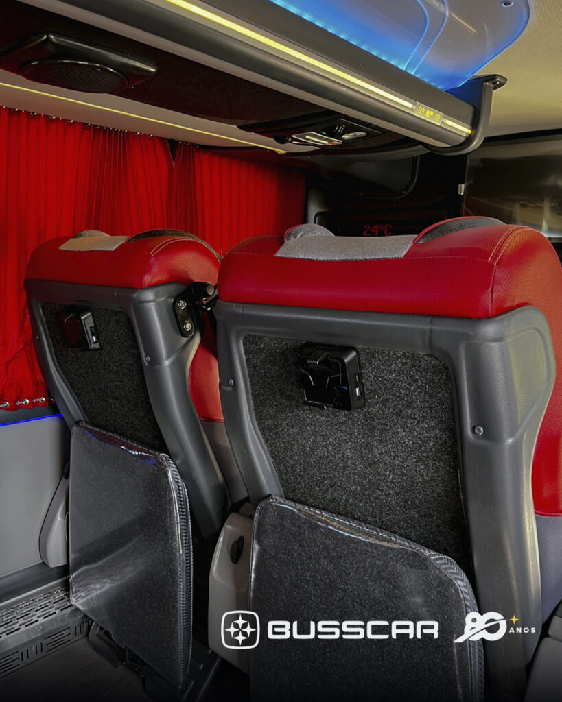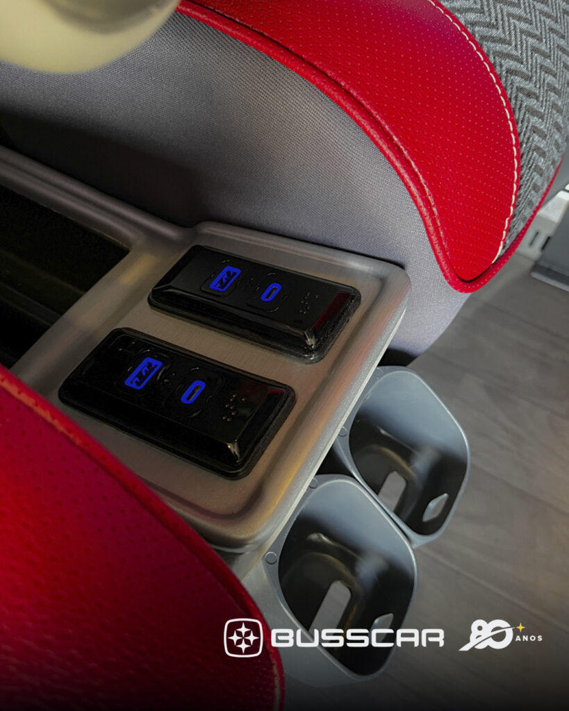 Além do conforto, as poltronas incorporam soluções que reforçam a segurança e a praticidade durante a viagem, como cinto de segurança retrátil de três pontos, porta-revistas tipo rede na traseira do encosto, ganchos para sacos de lixo na parte posterior das poltronas e porta-copos individuais, recursos que contribuem para a organização do espaço e para uma experiência de viagem mais funcional.
